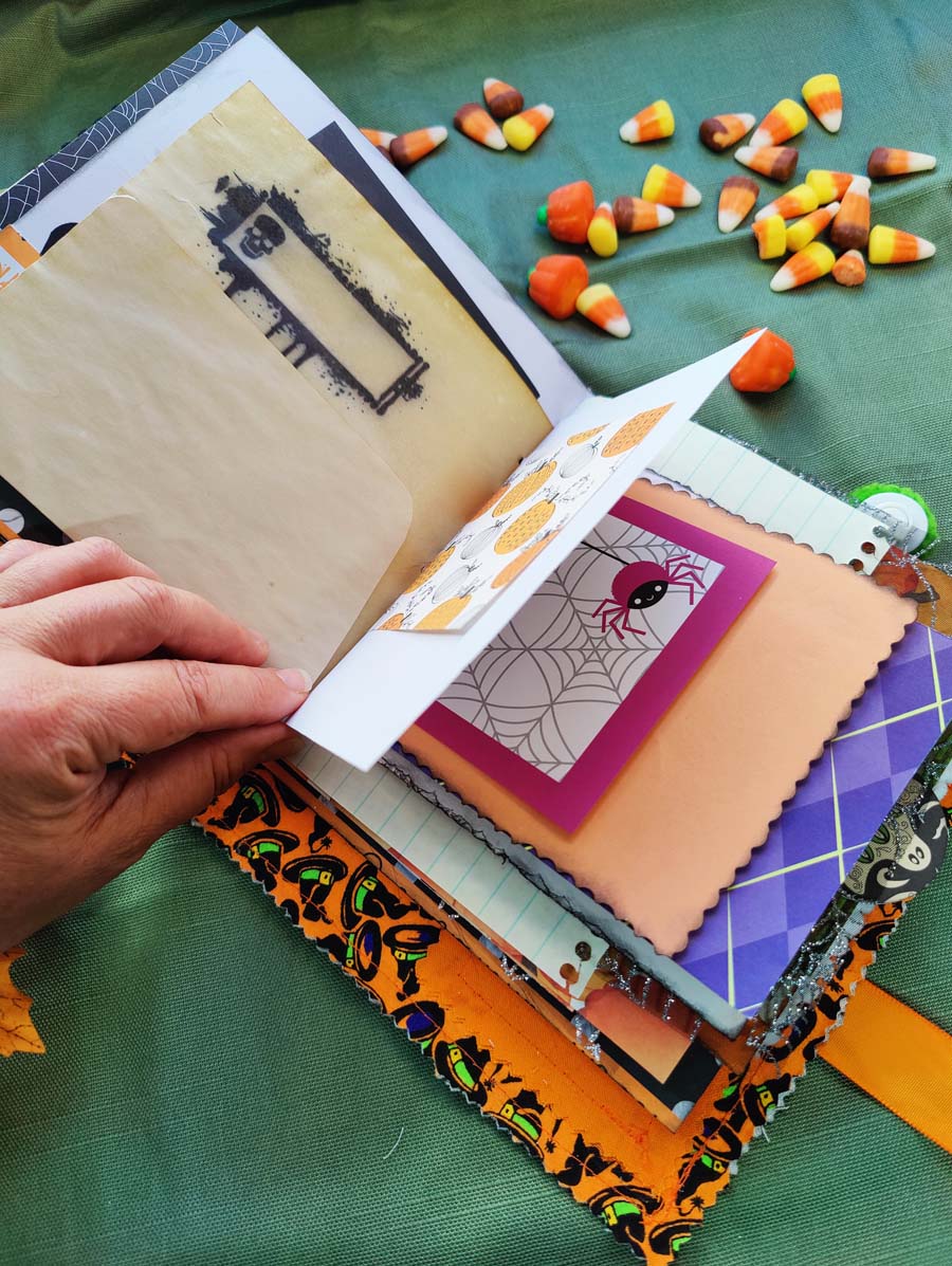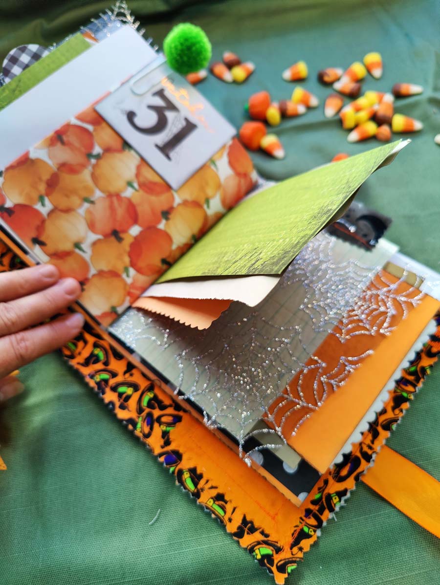 Though this is a smaller sized Journal, it has plenty of open space for writing and adding your own touch. It's smaller size makes it quite portable and the orange satin tie will ensure it stays closed when on the go. Lots of spider webs, jack-o-lanterns, and spooky cats as well as, fabric and paper tabs, pom pom trims, and decorative edges inside to inspire and delight!