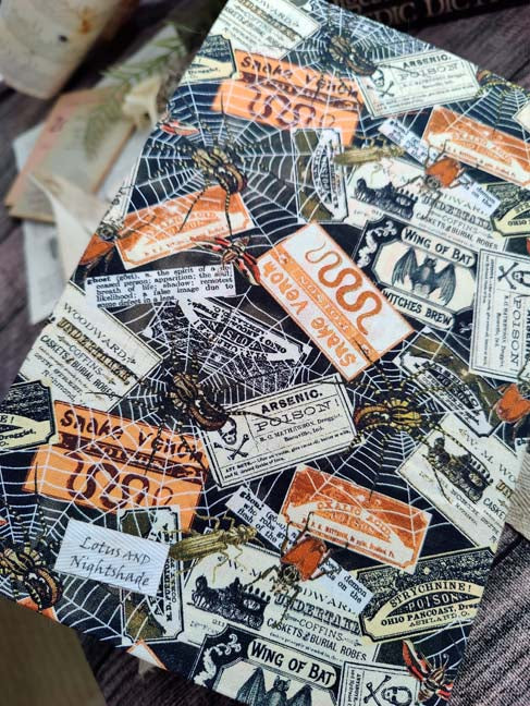The cover is made with a spooky, apothecary label collage fabric that features spider webs and spiders, different types of beetles, and a mix of vintage looking labels. 2 fabric pockets in coordinating colors with decorative elements adhered to them, hold tags and have a place to write your name.